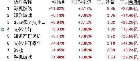 每经记者|杜恒峰 每经编辑|许绍航 记者|杜恒峰 编辑|许绍航 杜波 校对|金冥羽 封面图片|视觉中国(图文无关) 2月10日早盘,市场窄幅震荡,三大指数小幅下跌,截至收盘,沪指跌0.02%,深成指跌0.02%,创业板指跌0.14%。 盘面上热点快速轮动,全市场超2800只个股下跌。 从板块来看,传媒板块持续走高,读客文化、捷成股份、荣信文化、横店影视、上海电影、博纳影业、中国电影、光线传媒等多股涨停。文化传媒相关 ETF集体爆发,影视ETF(159855)、影视ETF(516620)盘中触及涨停,创历史新高。 | 板块名称 | 涨幅↓ | 1分钟涨速 | 王力净量 王力俭爵 | | --- | --- | --- | --- | | 影视院线 1 | +11.62% | +0.17% | 8.95 +25.95 7. | | 2 短剧游戏 | +6.19% | +0.09% | 2.35 +14.48 7. | | 3 Sora概念[文生... +6.04% | | +0.13% | 3.02 +26.28 7. | | 4 文化传媒 | +5.33% | +0.08% | 1.32 +16.48 Z | ...