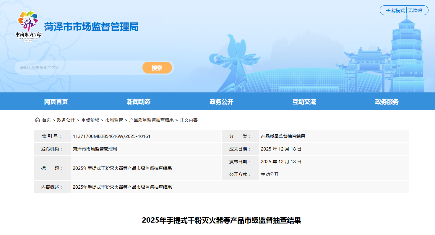 山东省菏泽市市场监管局公布2025年手提式干粉灭火器等产品市级监督抽查结果
