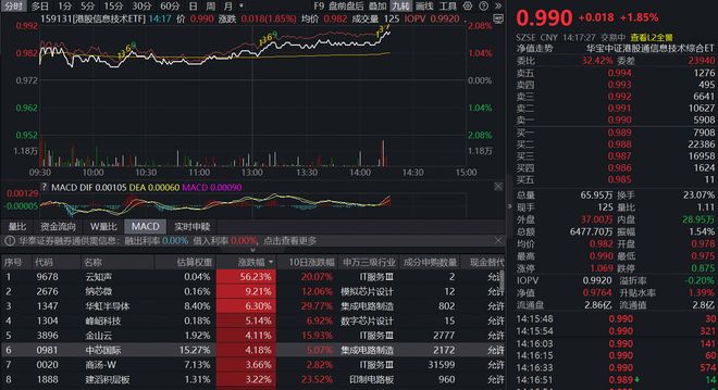 | | | 分时 $日 1分 5分 15分 30分 60分 日 周 月 · | | | | | F9 盘前盘后 叠加 九和 面线 工具 @ 1> | | | | | | --- | --- | --- | --- | --- | --- | --- | --- | --- | --- | --- | --- | | 0.992 | | | | 159131[瑞股信息技术ETF] 14:17 价 0.990 涨跌 0.018(1.85%) 均价 0.982 成交量 125 IDPV 0.9920 | | | | | | 0.990 +0.018 +1.85% | | | | | | | | | | | | | SZSE CNY 14:17:27 交易中 查看L2全国 | | | | | | | | | | | 1,04% | 净值速势 | 华宝中证港股通信息技术综合ET | | | | | | | | | | | | 委出 | 32.42% 委前 | 23940 | | 0.972 | | | | | | | | 0.00% | 旋五 10.05 | 0.994 0.993 | 1276 | | | | | | ...