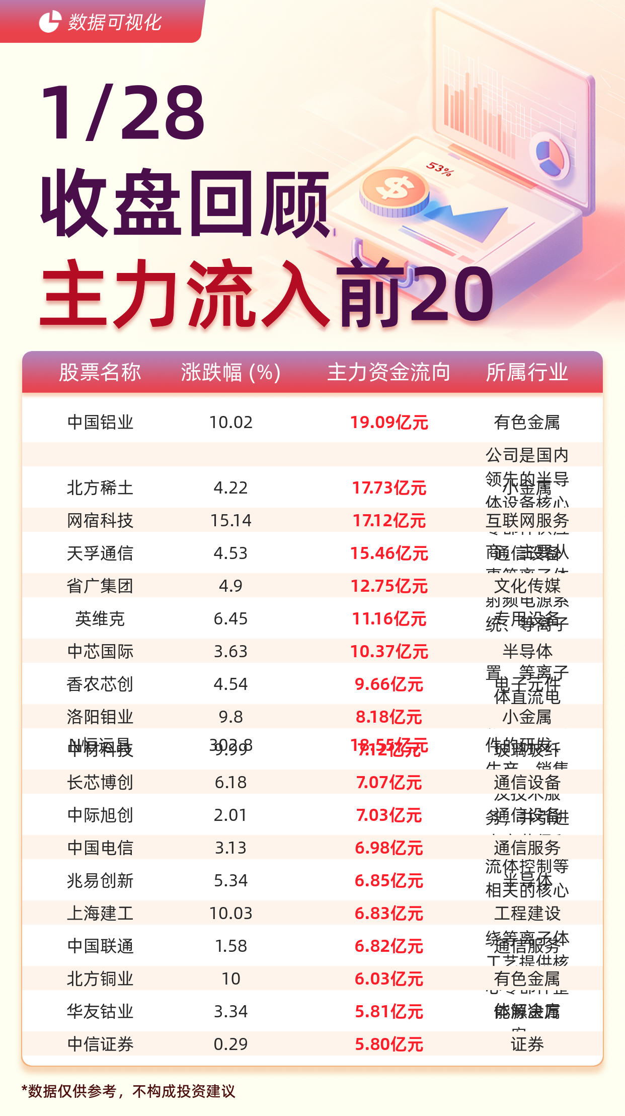 | 股票名称 | 涨跌幅(%) | 主力资金流向 | 所属行 | | --- | --- | --- | --- | | 中国铝业 | 10.02 | 19.09亿元 | 有色金属 | | | | | 公司是国 | | 北方稀土 | 4.22 | 17.73亿元 | 领先發農 | | | | | 木设备核 | | 网宿科技 | 15.14 | 17.12亿元 | 巨联网服 | | 天孚通信 | 4.53 | 15.46亿元 | 印信信 | | 省广集团 | 4.9 | 12.75亿元 | 又化传媒 | | 英维克 | 6.45 | 11.16亿元 | 别刺非泥 4757 HANA | | 中芯国际 | 3.63 | 10.37亿元 | | | 香农芯创 | 4.54 | 9.66亿元 | | | 洛阳钼业 | 9.8 | 8.18亿元 | | | 曾经过程 | 308g8 | 19:52 225 20 | 1888689 | | 长芯博创 | 6.18 | 7.07亿元 | 通信议 | | --- | --- | --- | --- | | 中际旭创 | 2.01 | 7.03亿元 | 報情報 | | 中国电 ...