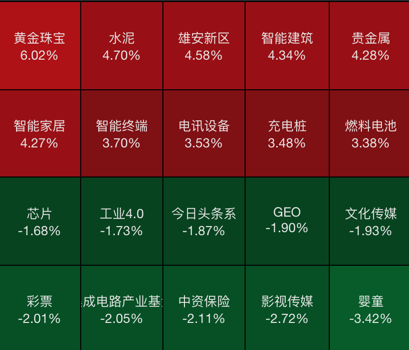 每经记者|马原 每经编辑|程鹏 记者|马原 编辑|程鹏 杜恒峰 校对|许绍航 2月11日,港股收盘, 恒生指数收涨0.31%,恒生科技指数收涨0.9%。 有色金属、稀土永磁板块上涨,赤峰黄金涨近6%,山东黄金涨4.4%,金力永磁涨5%,赣锋锂业涨5.5%。 | 黄金珠宝 | 水泥 | 雄安新区 | 智能建筑 | 贵金属 | | --- | --- | --- | --- | --- | | 6.02% | 4.70% | 4.58% | 4.34% | 4.28% | | 智能家居 | 智能终端 | 电讯设备 | 充电桩 | 燃料电池 | | 4.27% | 3.70% | 3.53% | 3.48% | 3.38% | | 芯片 | 工业4.0 | 令日头条系 | GEO | 文化传媒 | | -1.68% | -1.73% | -1.87% | -1.90% | -1.93% | | 彩票 | 成电路产业基 | 中资保险 | 影视传媒 | 恋宴 | | -2.01% | -2.05% | -2.11% | -2.72% | -3.42% | 光通信、cpo等板块回落,长飞光纤光缆跌近6%,剑桥科技跌5.7 ...