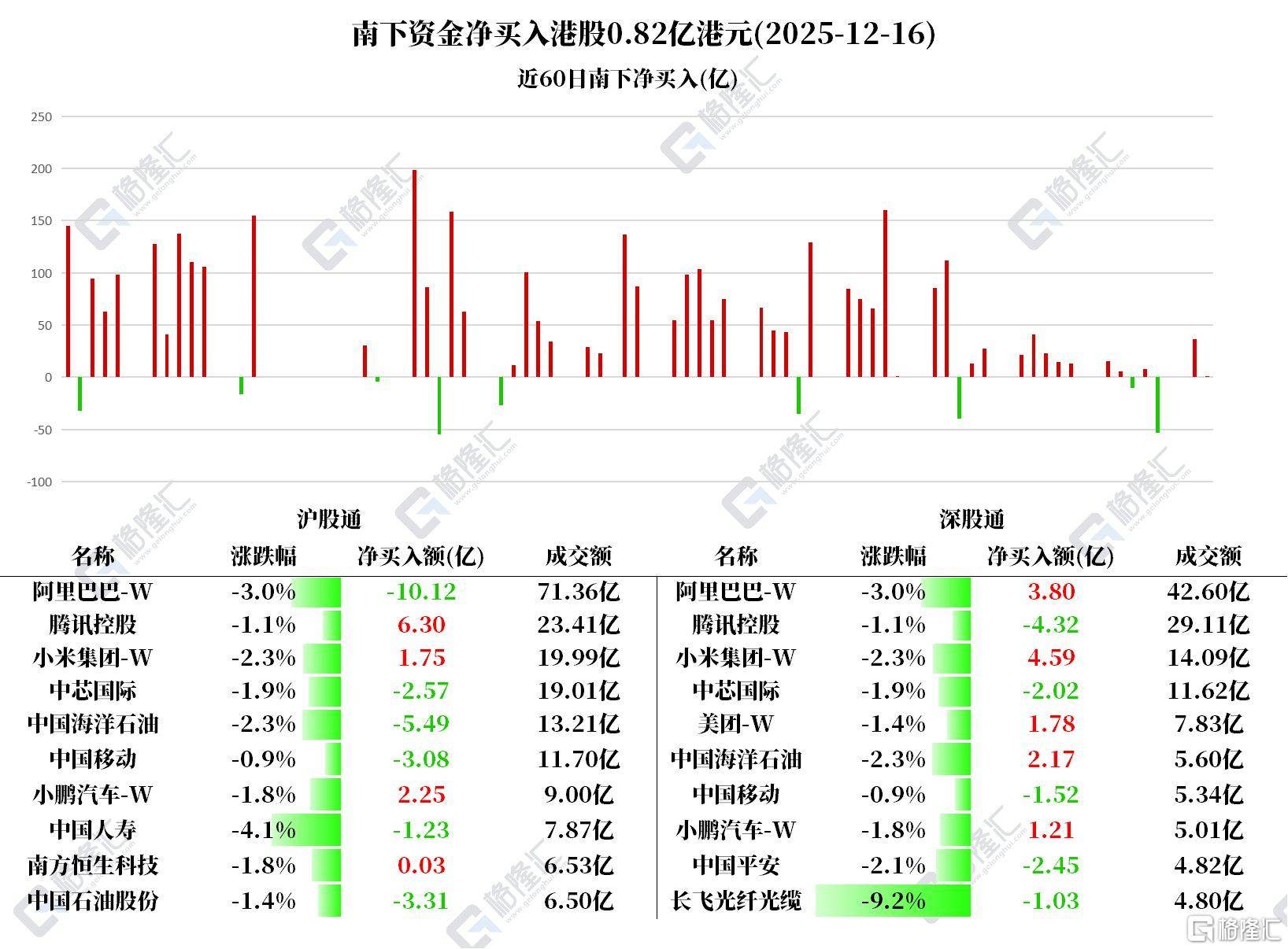 格隆汇12月16日|南下资金今日净买入港股8202.9万港元。其中: 据统计,南下资金已连续13日净买入小米,共计127.8378亿港元;连续5日净买入美团,共计48.0742亿港元;连续6日净卖出中芯国际,共计24.4528亿港 元;连续4日净卖出中海油,共计17.3379亿港元。(格隆汇) 净买入小米集团-W 6.33亿、小鹏汽车-W 3.45亿、腾讯控股1.97亿、美团-W 1.77亿; 净卖出阿里巴巴-W 6.31亿、中国移动4.6亿、中芯国际4.59亿、中国海洋石油3.32亿、中国石油股份3.3亿、中国平安2.45亿、中国人寿1.23亿、长飞光纤光缆 1.02亿。 | | 沪股通 | | | | | --- | --- | --- | --- | --- | | 名称 | 涨跌幅 | 净买入额(亿) | 成交额 | 名称 | | 阿里巴巴-W | -3.0% | -10.12 | 71.36 Z | 阿里巴巴-W | | 腾讯控股 | -1.1% | 6.30 | 23.41 Z | 腾讯控股 | | 小米集团-W | -2.3% | 1.75 | 19.99亿 | 小米集团-W | | 中芯国际 ...