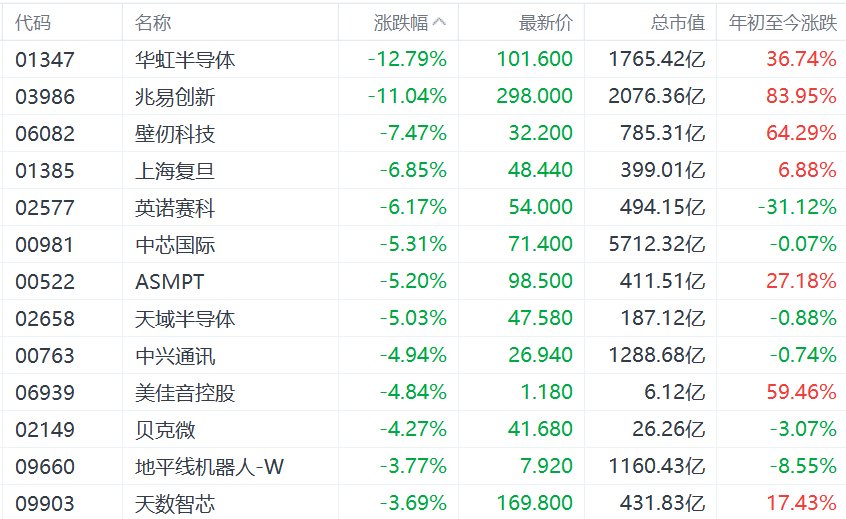 | 代码 | 名称 | 涨跌幅 ^ | 最新价 | 总市值 | 年初至今涨跌 | | --- | --- | --- | --- | --- | --- | | 01347 | 华虹半导体 | -12.79% | 101.600 | 1765.42 Z | 36.74% | | 03986 | 兆易创新 | -11.04% | 298.000 | 2076.36 乙 | 83.95% | | 06082 | 壁仍科技 | -7.47% | 32.200 | 785.31 乙 | 64.29% | | 01385 | 上海复目 | -6.85% | 48.440 | 399.01亿 | 6.88% | | 02577 | 英诺赛科 | -6.17% | 54.000 | 494.15 Z | -31.12% | | 00981 | 中本国际 | -5.31% | 71.400 | 5712.32 Z | -0.07% | | 00522 | ASMPT | -5.20% | 98.500 | 411.51 Z | 27.18% | | 02658 | 天域半导体 | -5.03% | 47.580 | 187. ...