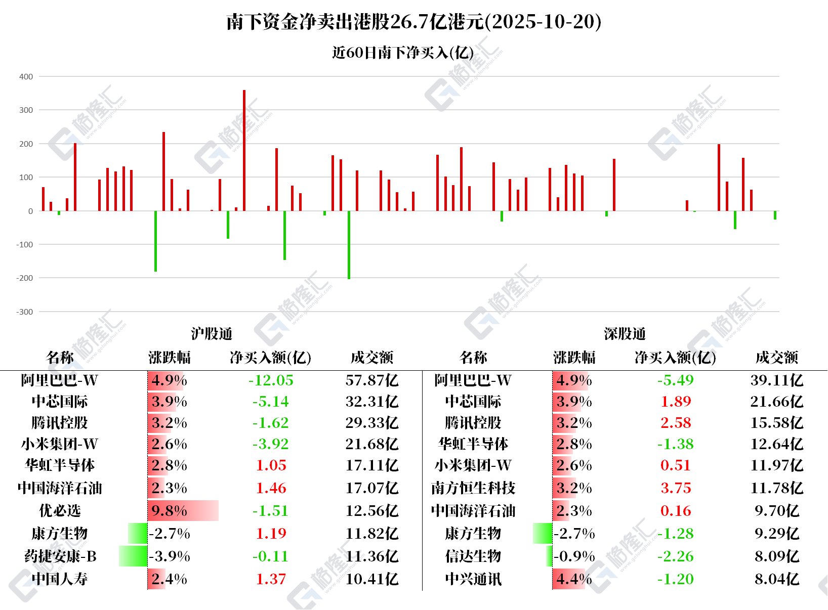 Core Insights - Southbound funds recorded a net sell of HKD 2.67 billion in Hong Kong stocks on October 20, with notable net purchases in Southern Hang Seng Technology, China National Offshore Oil Corporation, and China Life Insurance, while significant net sells were observed in Alibaba, Xiaomi, and SMIC [1][3]   Group 1: Stock Performance - Alibaba experienced a net sell of HKD 17.54 billion, with a decline of 4.9% in its stock price [3] - Xiaomi saw a net sell of HKD 3.4 billion, with a stock price drop of 2.6% [3] - SMIC faced a net sell of HKD 3.24 billion, with a 3.9% decrease in its stock price [3] - China National Offshore Oil Corporation had a net buy of HKD 1.62 billion, with a stock price increase of 2.3% [1][3] - Southern Hang Seng Technology recorded a net buy of HKD 3.75 billion, with a stock price increase of 3.2% [1][3]   Group 2: Company Developments - Alibaba's cloud division introduced a new solution, "Aegaeon," aimed at optimizing GPU resource utilization, which has been successfully applied in its cloud platform [4] - Xiaomi announced a partnership with BASF to develop 100 exclusive automotive paint colors over the next three years, reflecting a strategic move towards personalized automotive trends [4] - UBTECH Robotics appointed Yang Jifeng, former head of Great Wall Motors' AILab, as co-CEO to lead the development of industrial humanoid robots and autonomous logistics vehicles [4]   Group 3: Financial Forecasts - China Life Insurance projected a net profit of approximately HKD 156.785 billion to HKD 177.689 billion for the first three quarters of 2025, representing a year-on-year growth of 50% to 70% [5]