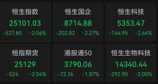 港股科技股集体下挫,恒生科技跌2.5%,阿里跌4%,中芯国际、腾讯音乐、阿里健康、小米、华虹半导体跌超3%