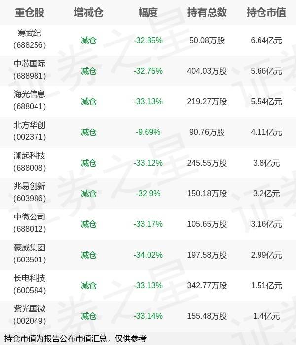 Group 1 - The core viewpoint of the article highlights the performance of the Penghua National Semiconductor Chip ETF, which reported a net asset value growth rate of 57.12% over the past year [1] - The largest holding in the fund is Cambricon Technologies (寒武纪), accounting for 12.37% of the portfolio [1] - The report details significant reductions in holdings across various stocks, with Cambricon Technologies seeing a decrease of 32.85% in shares held, valued at 664 million yuan [1] Group 2 - Other notable reductions include Zhongben International (中本国际) with a decrease of 32.75%, holding 4.04 million shares valued at 566 million yuan [1] - Haiguang Information (海光信息) also saw a reduction of 33.13%, with 2.19 million shares valued at 554 million yuan [1] - The report lists multiple companies with similar reductions, indicating a trend of decreased positions in semiconductor-related stocks [1]