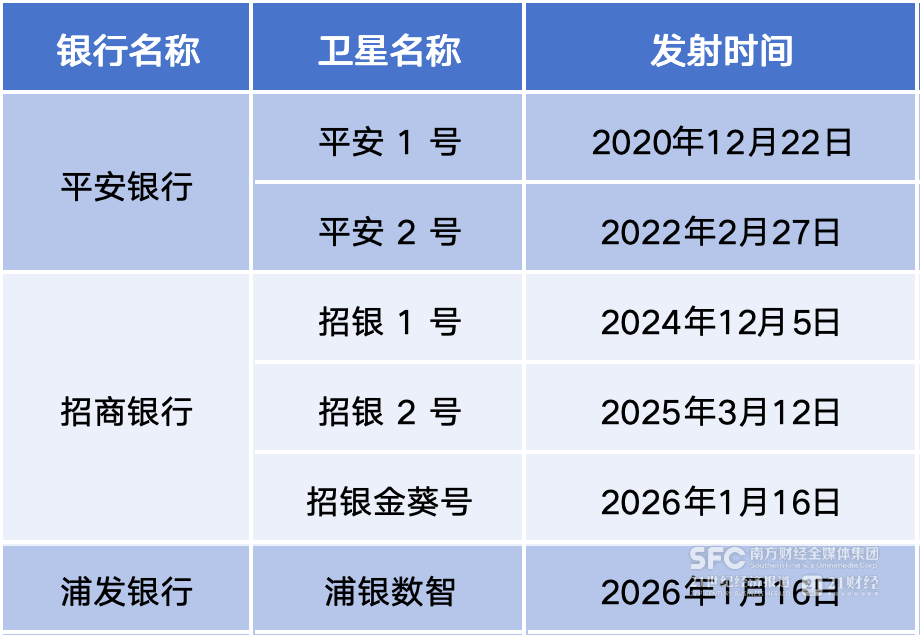 记者丨 曹媛 编辑丨孙超逸 1月16日,一道耀眼的尾焰划破山东日照的夜空,招商银行"招银金葵号"、浦发银行"浦银数 智"卫星成功发射升空,顺利进入预定轨道。 记者了解到,两颗卫星均隶属于我国首个全球组网的低轨卫星物联网星座"天启星座",由国家 级专精特新重点"小巨人"企业北京国电高科科技有限公司(简称"国电高科")自主研发运营。 这,并非银行首次"触摸星空"。 早在2020年、2022年前后,平安银行已发射"平安1号"和"平安2号"物联网卫星。如今三家头 部股份行齐聚太空,不禁让人好奇:一向深耕地面金融服务的银行,为何纷纷将目光投向浩瀚 宇宙? 记者从业内了解到,银行热衷于发射卫星,并非追逐概念热度,有其清晰的商业逻辑和服务国 家战略考量。 一是银行可依托遥感卫星技术实现对抵押物与项目进度的远程精准监控,极大提升贷后管 理效率、降低信贷风险。 二是在重大自然灾害等极端场景下,进一步提升金融机构的业务连续性保障能力。 三是通过深度参与火箭、卫星发射,服务国家战略,开拓金融服务赋能商业航天产业空 间。 | (记者曹媛/制图) | | --- | 招行+浦发+平安,三家股份行"太空玩家" 目前, 我国已有招商银行、 ...