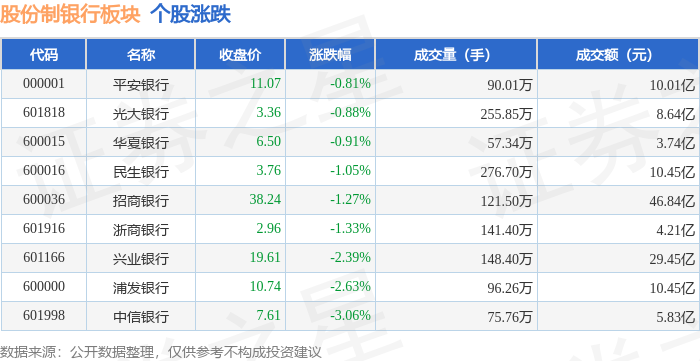 证券之星消息,1月21日股份制银行板块较上一交易日下跌1.78%,中信银行领跌。当日上证指数报收于 4116.94,上涨0.08%。深证成指报收于14255.12,上涨0.7%。股份制银行板块个股涨跌见下表: | 代码 | 名称 | 收盘价 | 涨跌幅 | 成交量(手) | 成交额(元) | | --- | --- | --- | --- | --- | --- | | 000001 | 平安银行 | 11.07 | -0.81% | 90.01万 | 10.01亿 | | 601818 | 光大银行 | 3.36 | -0.88% | 255.85万 | 8.64亿 | | 600015 | 华夏银行 | 6.50 | -0.91% | 57.34万 | 3.74亿 | | 600016 | 民生银行 | 3.76 | -1.05% | 276.70万 | 10.45 Z | | 600036 | 招商银行 | 38.24 | -1.27% | 121.50万 | 46.84亿 | | 601916 | 浙商银行 | 2.96 | -1.33% | 141.40万 | 4.21亿 | | 601166 | ...
