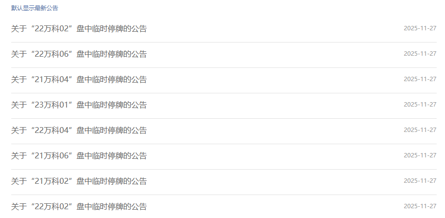 图片来源:深交所官网 消息面上,万科拟召开持有人会议协商20亿元中期票据展期事宜,引发市场关注。 11月26日晚间,万科在上清所发布公告称,将召开债权人会议讨论"22万科MTN004"的展期事项。公告称,根据《银行间债券市 场非金融企业债务融资工具持有人会议规程》及发行文件中相关条款规定,拟召开关于召开万科企业股份有限公司2022年度第四 期中期票据2025年第一次持有人会议的公告,会议召开时间为12月10日。本次会议涉及的"22万科MTN004"本金兑付日为2025年 12月15日,债项余额20亿元,计息期债项利率为3%。 | 关于"22万科02" 盘中临时停牌的公告 | 2025-11-27 | | --- | --- | | 关于"22万科06"盘中临时停牌的公告 | 2025-11-27 | | 关于"21万科04"盘中临时停牌的公告 | 2025-11-27 | | 关于"23万科01"盘中临时停牌的公告 | 2025-11-27 | | 关于"22万科04"盘中临时停牌的公告 | 2025-11-27 | | 关于"21万科06"盘中临时停牌的公告 | 2025-11-27 | | 关于"21万科 ...