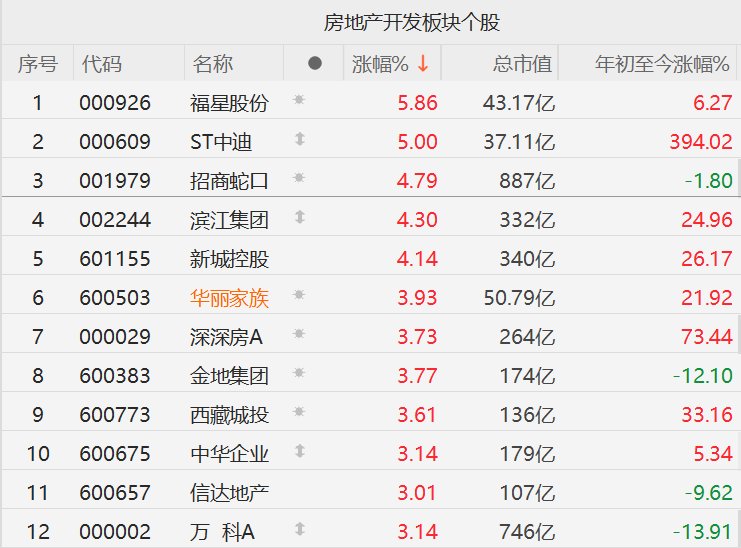 格隆汇11月20日|受相关传闻影响,A股市场部分地产股拉升,其中,招商蛇口、滨江集团、新城控股涨 超4%,华丽家族、深深房A、金地集团、西藏城投、中华企业、信达地产、万科A涨超3%。 | | | | | 房地产开发板块个股 | | | | --- | --- | --- | --- | --- | --- | --- | | 序号 | 代码 | 名称 | | 涨幅% ↓ | 总市值 | 年初至今涨幅%。 | | 1 | 000926 | 福星股份 | 一般 | 5.86 | 43.17亿 | 6.27 | | 2 | 000609 | ST中油 | 1 | 5.00 | 37.11亿 | 394.02 | | 3 | 001979 | 招商蛇口 | 资 | 4.79 | 887亿 | -1.80 | | ব | 002244 | 滨江集团 | 1 | 4.30 | 332亿 | 24.96 | | 5 | 601155 | 新城控股 | | 4.14 | 340亿 | 26.17 | | 6 | 600503 | 华丽家族 | 本 | 3.93 | 50.79 Z | 21.92 | | 7 | 000029 ...
