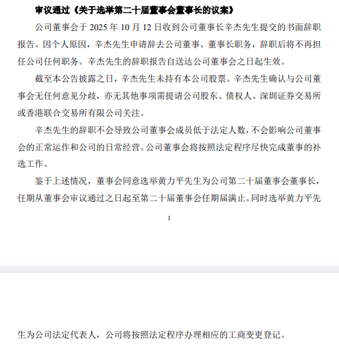 10月13日,万科企业在港交所公告称,公司董事会于2025年10月12日收到董事长辛杰先生提交的书面辞 职报告。辛杰先生因个人原因申请辞任公司非执行董事及董事长职务,辞任后将不再担任公司任何职 务。第二十届董事会第二十四次会议已选举黄力平担任董事长。 公告称,辛杰先生的辞职报告自送达董事会之日起生效。辛先生未持有公司股票,并确认与董事会无任 何意见分歧,亦无其他事项需提请公司股东、债权人、深圳证券交易所或香港联合交易所有限公司关 注。辛先生的辞任不会导致董事会成员低于法定人数,不会影响董事会的正常运作和公司的日常经营。 董事会将按照法定程序尽快完成董事的补选工作。 公司已于第二十届董事会第二十四次会议上选举黄力平先生担任董事长,任期自董事会审议通过之日起 至公司第二十届董事会任期届满之日止。 黄力平先生,1968年出生,现任公司董事、审计委员会委员,深圳市地铁集团有限公司党委副书记、董 事、总经理。黄先生于1991年获同济大学工学学士学位;1994年获同济大学工学硕士学位;现为教授级 高级工程师。2014年8月至2018年8月,任深圳市地铁集团有限公司副总经理、党委委员;2018年8月至 2021年2月,任深 ...
