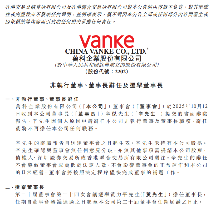 智通财经APP讯,万科企业(02202)发布公告,董事会于2025年10月12日收到本公司董事长(董事长)辛杰 先生(辛先生)提交的书面辞职报告。辛先生因个人原因申请辞任本公司非执行董事及董事长职务,辞任 后将不再担任本公司任何职务。 第二十届董事会第二十四次会议选举黄力平先生(黄先生)担任董事长,任期自董事会审议通过之日起至 本公司第二十届董事会任期届满之日止。 ...