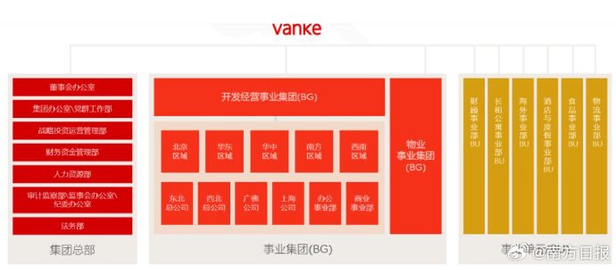 近日,万科官网已完成组织架构及管理团队信息的更新,标志着其筹备已久的组织架构大调整正式落 地。 新的组织架构中,集团总部被分为董事会办公室、集团办公室/党群工作部和11个中心。 原先的五 大区域公司平台全部撤销,取而代之的是全国16个地区公司,分别为北京公司、津冀公司、山东公司、 上海公司、浙江公司、华中公司等,这也意味着万科全面进入强集团二级管控体系。 此外,本次架构 调整后新设立事业部,由8个分属不同业务的事业部组成,涵盖物业、商业与酒店、办公、长租公寓、 海外、食品、物流及财顾。 在业内看来,万科此次调整并非突然,此前已多次进行区域调整。在当前 市场环境下,行业进入"瘦身期",万科通过减少管理层级,缩短决策链条,实现资源的集中调度和统一 管理,以提升运营效率,增强对市场的敏感度和应对能力,适应从区域公司管理模式向总公司模式的转 变,更好地在市场竞争中立足。 与架构调整同步推进的是开发业务相关管理层的配齐。集团层面,董 事长辛杰、工会主席解冻、执行副总裁郁亮、执行副总裁李锋、执行副总裁华翠、执行副总裁兼财务负 责人韩慧华、董事会秘书田钧等人,以及分别负责物业、商业与酒店事业部的朱保全、孙嘉职务不变。 集团 ...