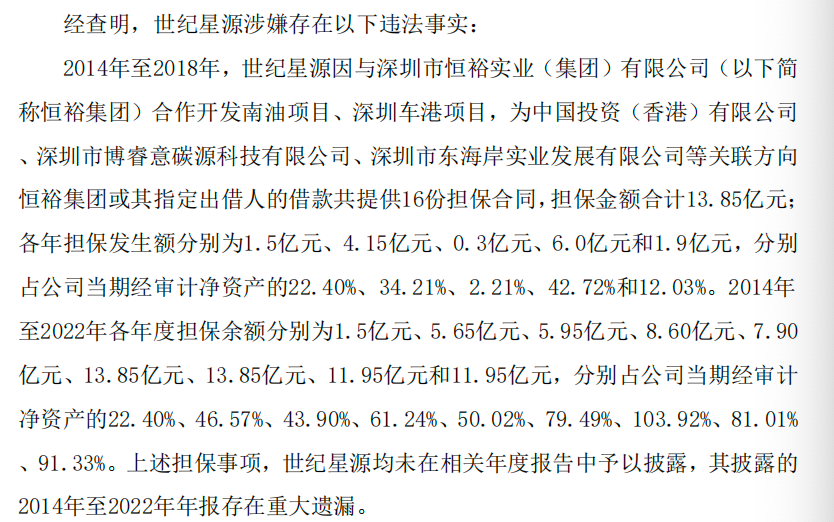 【导读】世纪星源涉嫌重大信披违规,被证监局处罚 中国基金报记者储是 因长达八年未披露担保事项,世纪星源收罚单。公司及责任人共被罚2175万元,此前已退市。 长达八年的信披违规 12月31日,长城证券股份有限公司(以下简称长城证券)发布风险提示公告。 公告显示,长城证券收悉深圳证监局向深圳世纪星源股份有限公司(以下简称世纪星源)出具的《行政处罚事先告知 书》。 深圳证监局决定,对深圳世纪星源股份有限公司责令改正,给予警告,并处以500万元罚款。 时任公司董事长丁芃、董事兼总经理郑列列作为实际控制人,被认定"明知年报存在重大遗漏仍签字保证",且"私自使 用公司印章签订担保合同"。 上述担保事项,世纪星源未在相关年度报告中予以披露,存在重大遗漏。 此前,世纪星源已宣布退市。 根据ST星源公告,公司于2024年4月11日收到深圳证券交易所出具的《关于深圳世纪星源股份有限公司股票终止上市 的决定》,深圳证券交易所决定终止公司股票上市。 主要由于公司股票在2024年1月30日至2024年3月5日期间,连续二十个交易日的每日收盘价均低于1元/股,触及股票终 止上市情形。 公司及责任人共被罚2175万元 深圳证监局查明,20 ...