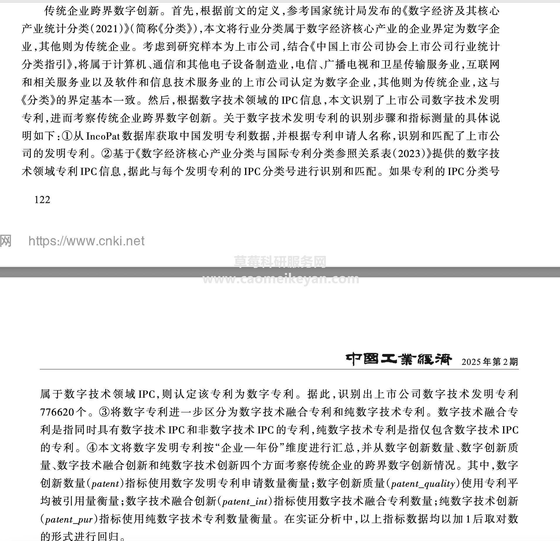 1.资料名称:2024-2000年上市公司企业传统企业跨界绿色数字创新数据 2.测算方式:参考顶刊《中国工业经济》陶锋(2025)老师的做法,具体如下图文献所示。首先,根据前文的定义,参考国家统计局发布的《数字经济及其 核心产业统计分类(2021)》(简称《分类》),本文将行业分类属于数字经济核心产业的企业界定为数字企业,其他则为传统企业。考虑到研究样本为上 市公司,结合《中国上市公司协会上市公司行业统计分类指引》,将属于计算机、通信和其他电子设备制造业,电信、广播电视和卫星传输服务业,互联网 和相关服务业以及软件和信息技术服务业的上市公司认定为数字企业,其他则为传统企业,这与《分类》的界定基本一致。然后,根据数字技术领域的IPC 信息,本文识别了上市公司数字技术发明专利,进而考察传统企业跨界数字创新。关于数字技术发明专利的识别步骤和指标测量的具体说明如下:①从 IncoPat数据库获取中国发明专利数据,并根据专利申请人名称,识别和匹配了上市公司的发明专利。②基于《数字经济核心产业分类与国际专利分类参照 关系表(2023)》提供的数字技术领域专利IPC信息,据此与每个发明专利的IPC分类号进行识别和匹配。如果 ...