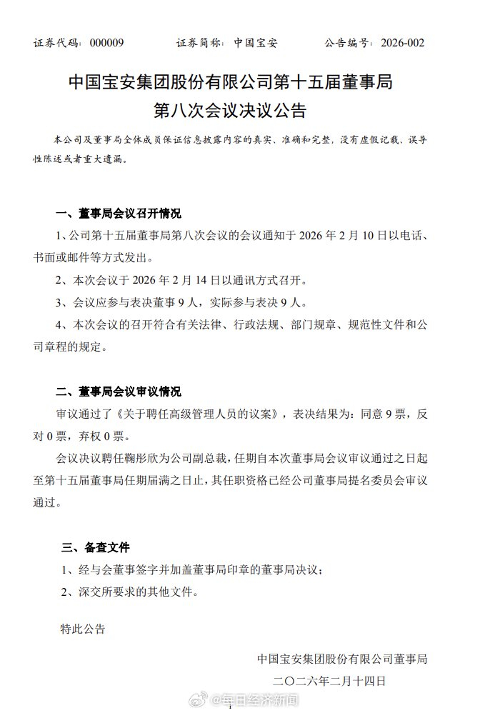 登录新浪财经APP 搜索【信披】查看更多考评等级 证券代码:000009 证券简称:中国宝安 公告编号:2026-002 中国宝安集团股份有限公司第十五届董事局 第八次会议决议公告 本公司及董事局全体成员保证信息披露内容的真实、准确和完整,没有虚假记载、误导性陈述或者重大 遗漏。 一、董事局会议召开情况 1、公司第十五届董事局第八次会议的会议通知于2026年2月10日以电话、书面或邮件等方式发出。 2、本次会议于2026年2月14日以通讯方式召开。 会议决议聘任鞠彤欣为公司副总裁,任期自本次董事局会议审议通过之日起至第十五届董事局任期届满 之日止,其任职资格已经公司董事局提名委员会审议通过。 三、备查文件 1、经与会董事签字并加盖董事局印章的董事局决议; 2、深交所要求的其他文件。 特此公告 中国宝安集团股份有限公司董事局 二〇二六年二月十四日 3、会议应参与表决董事9人,实际参与表决9人。 4、本次会议的召开符合有关法律、行政法规、部门规章、规范性文件和公司章程的规定。 二、董事局会议审议情况 审议通过了《关于聘任高级管理人员的议案》,表决结果为:同意9票,反对0票,弃权0票。 附:简历 鞠彤欣,女,199 ...