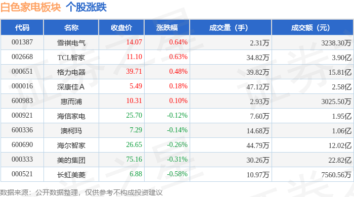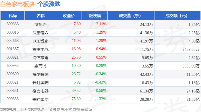 证券之星消息,11月4日白色家电板块较上一交易日下跌0.1%,长虹美菱领跌。当日上证指数报收于 3960.19,下跌0.41%。深证成指报收于13175.22,下跌1.71%。白色家电板块个股涨跌见下表: | 代码 | 名称 | 收盘价 | 涨跌幅 | 成交量(手) | 成交额(元) | | | --- | --- | --- | --- | --- | --- | --- | | 001387 | 雪祺电气 | 14.07 | 0.64% | 2.31万 | | 3238.30万 | | 002668 | TCL智家 | 11.10 | 0.63% | 34.82万 | | 3.90亿 | | 000651 | 格力电器 | 39.71 | 0.48% | 39.82万 | | 15.81 乙 | | 000016 | 深康佳A | 5.49 | 0.18% | 47.12万 | | 2.58亿 | | 600983 | 惠而浦 | 10.31 | 0.10% | 2.93万 | | 3025.50万 | | 000921 | 海信家电 | 25.70 | -0.12% | 7.60万 | | 1.95亿  ...