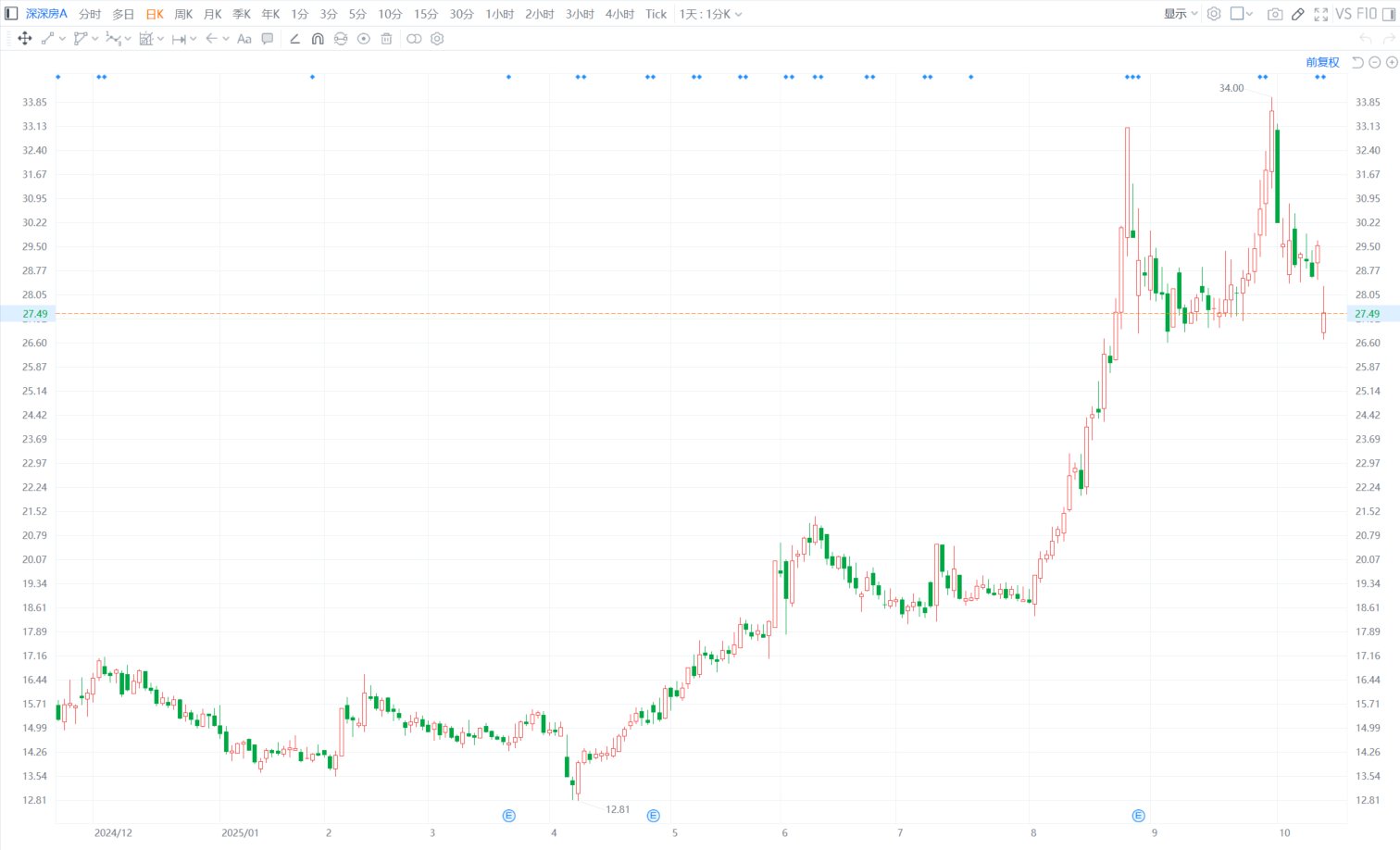 | ■ 深深房A 分时 | 多日 日K 周K | 月K 季K 年K ાસે 33 | રસ્ત્ર 103 | | 15分 30分 1小时 2小时 | | 3小时 | 4小时 | Tick 1天:1分Kv | | --- | --- | --- | --- | --- | --- | --- | --- | --- | --- | | નું P | NV | 固の母のフレロンアー | | 0 @ | | | | | | | 33.85 | | | | | | | | | | | 33.13 | | | | | | | | | | | 32.40 | | | | | | | | | | | 31.67 | | | | | | | | | | | 30.95 | | | | | | | | | | | 30.22 | | | | | | | | | | | 29.50 | | | | | | | | | | | 28.77 | | | | | | | | | | | 28.05 | | | | | | | | | | | 27.49 | | | | | | | | | | | 26.60 | | | | | | ...