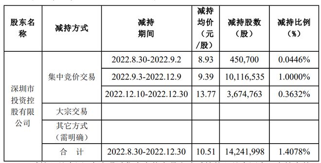 10月20日晚间,深深房A发布公告,控股股东深圳市投资控股有限公司(简称"深投控")拟自公告披露 之日起15个交易日后的3个月内,即2025年11月11日至2026年2月10日,以集中竞价方式减持不超过 1011.66万股,减持比例不超过公司总股本的1%。 | | | | 减持 | | | | --- | --- | --- | --- | --- | --- | | 股东名 | 減持方式 | 猿持 | 均价 | 减持股数 | 减持比例 | | 称 | | 期间 | (元 | (股) | (%) | | | | | /股) | | | | | 集中竞价交易 | 2022.8.30-2022.9.2 2022.9.3-2022.12.9 | 8.93 9.39 | 450,700 10.116.535 | 0.0446% | | | | | | | 1.0000% | | 深圳市 投资控 | | 2022.12.10-2022.12.30 | 13.77 | 3.674.763 | 0.3632% | | 股有限 | 大宗交易 | | | | | | 公司 | 其它方式 | | | | | | | (需明确)  ...