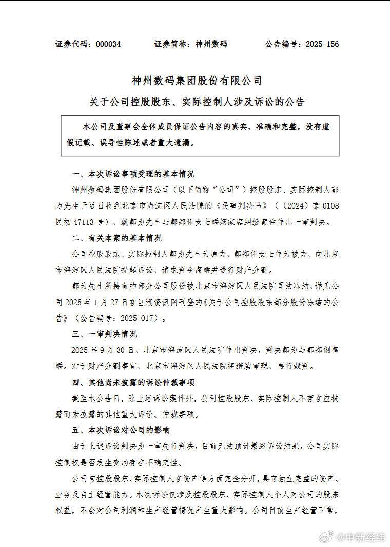 扬子晚报网10月12日讯(记者范晓林薄云峰实习生魏静萱)神州数码(000034)10月10日晚发布公告称,公司控股股东、实际控制人郭为近日收到北京市海 淀区人民法院的《民事判决书》,就郭为与郭郑俐的婚姻家庭纠纷案件作出一审判决。 神州数码公告。 10月11日,神州数码股价以43.06元/股收盘,市值为315.88亿元。 神州数码称,由于上述诉讼判决为一审先行判决,目前无法预计最终诉讼结果,公司实际控制权是否发生变动存在不确定性。公司与控股股东、实际控制 人在资产等方面完全分开,具有独立完整的资产、业务体系及自主经营能力。 公开资料显示,郭为,1963年生于河北省秦皇岛市,中国科学技术大学管理学硕士,高级工程师,现任神州数码集团股份有限公司董事长、神州数码控股 有限公司董事局主席、神州数码信息服务集团股份有限公司董事长。2025年9月30日因婚姻家庭纠纷被北京市海淀区人民法院一审判决离婚,其名下 7738.89万股神州数码股份被司法冻结,占其所持公司股份的50%,占公司总股本的11.56%,冻结到期日为2028年1月21日。对应市值约33.94亿元。 郭郑俐毕业于美国布朗大学,获电气工程学士学位和硕士学位,还获 ...