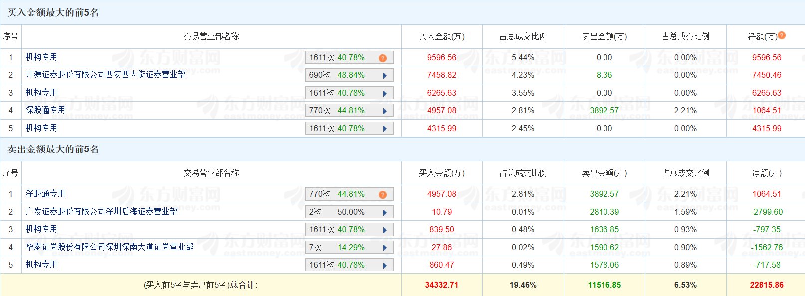 | | 2025-11-26 星期三 类型:日涨幅偏离值达到7%的前5只证券 | | | | | | 收盘价:9.35元 张跌幅:10.00% 成交里:19474.24万股 成交金额:176449.31万元 | | | --- | --- | --- | --- | --- | --- | --- | --- | --- | | 买入金额最大的前5名 | | | | | | | | | | 序号 | 交易营业部名称 | | | 买入金额(万) | 占总成交比例 | 卖出金额(万) | 占总成交比例 | 争额(万)2 | | 1 | 机构专用 | | 1611次 40.78% 2 | 9596 56 | 5.44% | 0.00 | 0.00% | 0596.56 | | 2 | 开源证券股份有限公司网安西大陆站群发出 | | 690次 48.84% b | 7458.82 | 4.23% | 8.36 | 0.00% | 7450.46 | | 3 | 机构专用 | | 1611次 40.78% | 6265.63 | 3,55% | 0.00 | 0.00% | 6265.63 | | 4 | 深展通专用 ...
