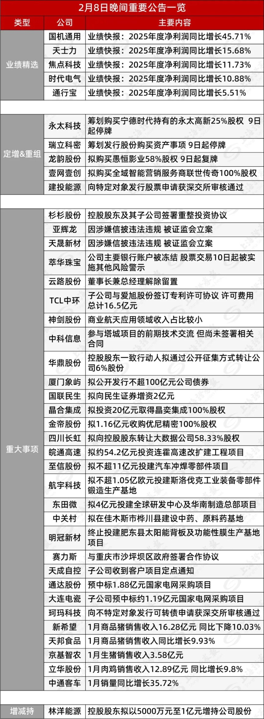 | | | 2月8日晚间重要公告一览 | | --- | --- | --- | | 类型 | 公司 | 主要内容 | | 业绩精选 | 国机通用 | 业绩快报:2025年度净利润同比增长45.71% | | | 天士力 | 业绩快报:2025年度净利润同比增长15.68% | | | 焦点科技 | 业绩快报:2025年度净利润同比增长11.73% | | | 时代电气 | 业绩快报: 2025年度净利润同比增长10.88% | | | 通行宝 | 业绩快报:2025年度净利润同比增长5.51% | | 定增&重组 | 永太科技 | 筹划购买宁德时代持有的永太高新25%股权 9日 | | | | 起停牌 | | | 瑞立科密 | 筹划发行股份购买资产事项 9日起停牌 | | | 龙韵股份 | 拟购买愚恒影业58%股权 9日起复牌 | | | 营网营创 | 拟购买全域智能营销服务商联世传奇100%股权 | | | 建投能源 | 向特定对象发行股票申请获深交所审核通过 | | | 杉杉股份 | 控股股东及其子公司签署重整投资协议 | | | 亚辉龙 | 因涉嫌信披违法违规 被证监会立案 | | | 天晟新材 | ...