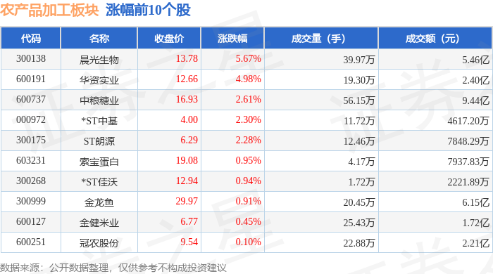 | 代码 | 名称 | 收盘价 | 涨跌幅 | 成交量(手) | 成交额(元) | | --- | --- | --- | --- | --- | --- | | 600962 | 園投中鲁 | 23.11 | -3.35% | 11.41万 | 2.66亿 | | 000505 | 京根控股 | 7.54 | -1.69% | 36.03万 | 2.74亿 | | 000930 | 中根科技 | 5.91 | -1.01% | 23.16万 | 1.38亿 | | 001338 | 永顺泰 | 12.15 | -0.98% | 11.05万 | 1.35亿 | | 605198 | 安德利 | 39.48 | -0.88% | 2.42万 | 9647.76万 | | 002481 | 双塔食品 | 5.10 | -0.78% | 26.56万 | 1.36亿 | | 000911 | 广农糖业 | 7.45 | -0.53% | 8.42万 | 6280.94万 | | 603182 | 喜华股份 | 15.75 | -0.51% | 2.42万 | 3797.47万 | | 920273 | 一致魔手 ...