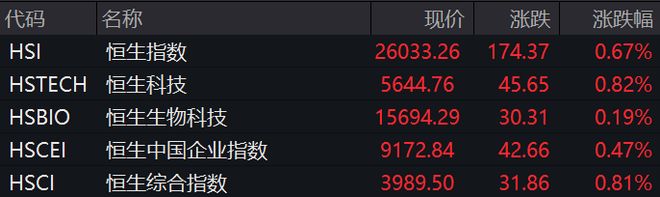 | 名称 | 现价 | 涨跌幅 ▼ | | --- | --- | --- | | 中国黄金国际 | 165.500 c | 11.37% | | 中国白银集团 | 0.750c | 5.63% | | 常金矿业 | 32.320c | 5.28% | | 灵宝黄金 | 17.070c | 4.21% | | 山东黄金 | 35.980 c | 4.05% | | 招金矿业 | 30.140c | 3.72% | | 周大福 | 14.140c | 3.59% | | 国际资源 | 10.800c | 3.55% | | 珠峰黄金 | 2.400 c | 3.00% | | 紫金黄金国际 | 143.300c | 2.95% | | 代码 | 名称 | 现价 | 涨跌 | 涨跌幅 | | --- | --- | --- | --- | --- | | મટા | 恒生指数 | 26033.26 | 174.37 | 0.67% | | HSTECH | 恒生科技 | 5644.76 | 45.65 | 0.82% | | HSBIO | 恒生生物科技 | 15694.29 | 30.31 | 0.19% | ...