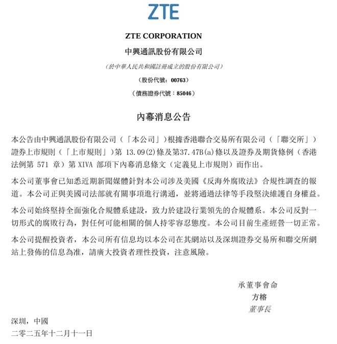 中兴通讯最新公告。 12月11日,中兴通讯在港交所公告称, 公司董事会已知悉近期新闻媒体针对公司涉及美国《反海外腐败法》合规性调查的报道。公司正与美国司法部就有关事项 进行沟通,并将通过法律等手段坚决维护自身权益。 中兴通讯强调,公司始终坚持全面强化合规体系建设,致力于建设行业领先的合规体系。公司反对一切形式的腐败行为,对任何可能相关的个人持零容忍态度。同 时,中兴通讯表示,公司目前生产经营一切正常。 此外,中兴通讯在港上市的认购证大跌超28%。 综合自:公司公告、Wind行情 责编:万健祎 校对: 祝甜婷 二级市场上,今日,中兴通讯A股、港股双双大跌,截至午间收盘,中兴通讯A股(000063)跌7.73%,中兴通讯港股(00763.HK)跌9.36%。 END 版权声明 证券时报各平台所有原创内容,未经书面授权,任何单位及个人不得转载。我社保留追 究相关 行 为主体法律责任的权利。 转载与合作可联系证券时报小助理,微信ID:SecuritiesTimes 点击关键字可查看 潜望系列深度报道丨 股事会专栏 丨 投资小红书 丨 e公司调查 丨 时报会客厅 丨 十大明星私募访谈 丨 4000亿+!摩尔线程,再度大 ...