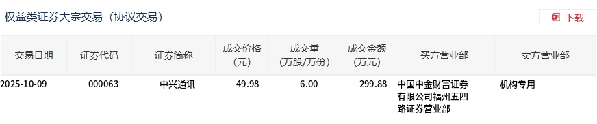 10月9日,中兴通讯大宗交易成交6万股,成交额299.88万元,占当日总成交额的0.01%,成交价49.98元,较市场收盘价49.98 元持平。 | 交易日期 | 证券代码 | 证券简称 | 成交价格 | 成交量 | 成交金额 买方营业部 | | 卖方营业部 | | --- | --- | --- | --- | --- | --- | --- | --- | | | | | (元) | (万股/万份) | (万元) | | | | 2025-10-09 | 000063 | 中兴通讯 | 49.98 | 6.00 | 299.88 中国中金财富证券 | | 机构专用 | | | | | | | | 有限公司福州五四 | | | | | | | | | 路证券营业部 | | ...