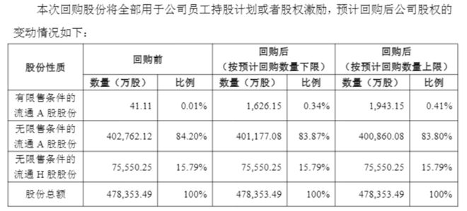 12月12日午间,中兴通讯公告,公司拟使用自有资金以集中竞价交易方式回购公司A股股 份,用于实施公司员工持股计划或者股权激励。本次回购资金总额为不低于10亿元且不超 过12亿元(均包含本数)。 中兴通讯表示, 本公司始终坚持全面强化合规体系建设,致力于建设行业领先的合规体 系。本公司反对一切形式的腐败行为,对任何可能相关的个人持零容忍态度。本公司目前生 产经营一切正常。 据公告,按照回购资金上限12亿元、回购A股股份价格上限63.09元/股测算,公司本次回 购股份数量约为1902.04万股,约占公司目前总股本的0.40%。具体回购股份的数量以回 购期满时实际回购的股份数量为准。本次回购期限自董事会审议通过本次回购方案之日起 12个月内。 | 股份性质 | 回购前 | | 回购后 | | 回购后 | | | --- | --- | --- | --- | --- | --- | --- | | | | | (按预计回购数量下限) | | (按预计回购数量上限) | | | | 数量(万股) | 比例 | 数量(万股) | 比例 | 数量(万股) | 比例 | | 有限售条件的 流通 A 股股份 | 41.11 ...