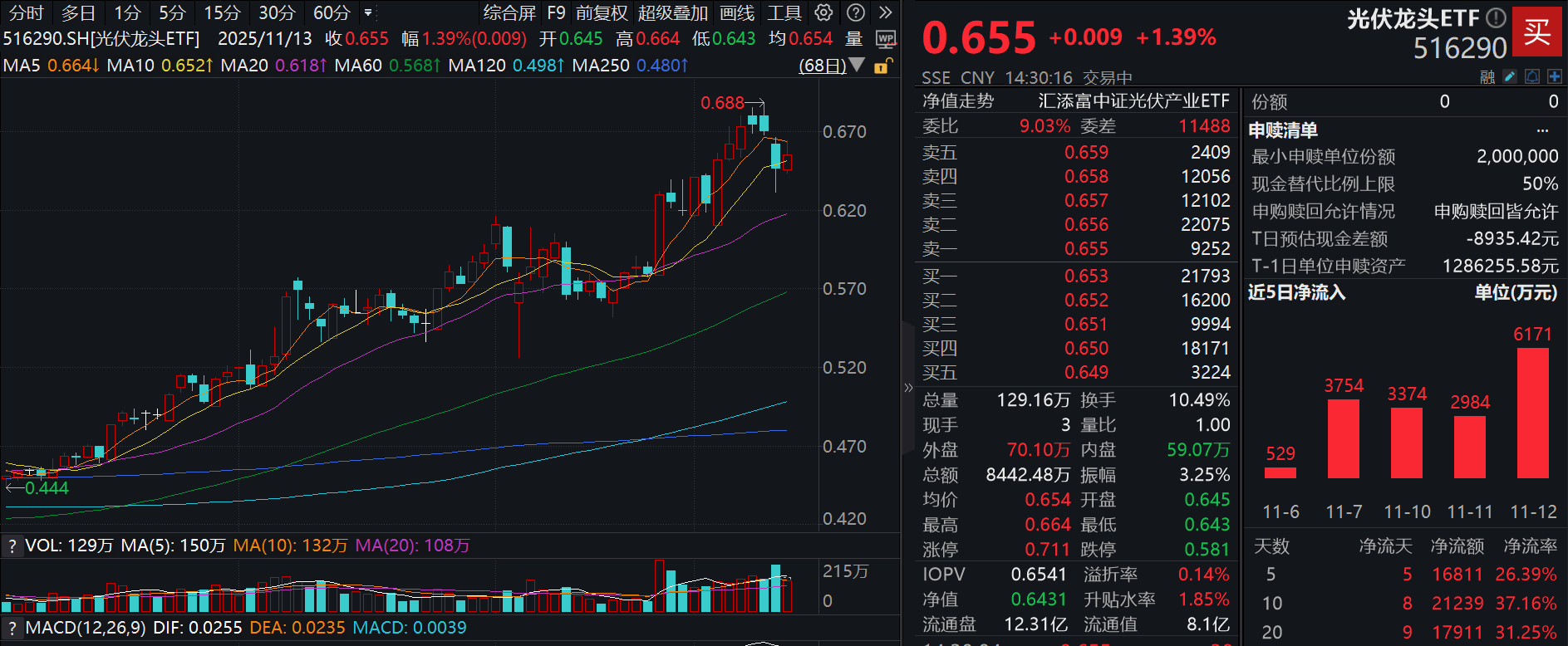 11月13日,受光伏协会发声、晶澳科技辟谣不实传闻催化,光伏板块强劲反弹!截至14:30,同类费率最低档的光伏龙头ETF(516290)上涨1.39%,盘中一度 涨超2%,资金接连涌入,成交额超8400万元,光伏龙头ETF(516290)已连续7日净流入,累计吸金超1.8亿元! 对此,通威股份也表示,公司坚定看好和支持光伏"反内卷"行动,坚信相关政策必将逐步落地实施,并将积极配合和支持各项工作的展开。 光伏行业"反内卷"火热进行中, "收储平台"是其中重要举措之一。据报道,备受关注的多晶硅重组"联合体"平台正在筹划中,目前规划预计成立700亿元左 右规模的基金,经讨论后,将采用百亿资金撬动700亿的"承债式"方式收购。 【短期:多晶硅供需现实仍有压力】 | 序号 | 代码 | 名称 | 涨跌幅 | | | --- | --- | --- | --- | --- | | 1 | 300274 | 阳光电源 | 0.39% | 18.83% | | 2 | 600089 | 特变电工 | 1.97% | 9.23% | | 3 | 601012 | 隆基绿能 | 1.92% | 8.99% | | 4 | 000 ...