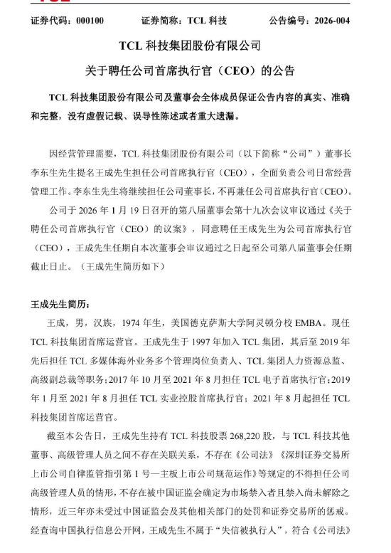 新浪科技讯 1月22日午间消息,TCL科技日前发布公告称,公司董事会已审议通过聘任王成担任首席执 行官(CEO)的议案,全面负责公司日常经营管理工作。这意味着创始人李东生将卸下兼任的CEO职 务,仅保留董事长一职。 新浪科技讯 1月22日午间消息,TCL科技日前发布公告称,公司董事会已审议通过聘任王成担任首席执 行官(CEO)的议案,全面负责公司日常经营管理工作。这意味着创始人李东生将卸下兼任的CEO职 务,仅保留董事长一职。 王成是TCL集团的"老兵",自1997年加入公司以来,历任多媒体海外业务负责人、集团人力资源总监、 高级副总裁等多个核心岗位,还曾担任TCL电子、TCL实业控股的CEO,自2021年8月起担任集团首席 运营官。 此次人事调整是公司经营管理的重要安排,王成凭借近30年的行业经验与对集团的深度了解,被认为能 够平稳承接管理职责。截至公告日,王成持有TCL科技26.822万股股份,不存在不符合任职资格的情 形。市场普遍认为,这一变动标志着TCL科技向专业化管理进一步迈进。(文猛) 责任编辑:韦子蓉 责任编辑:韦子蓉 王成是TCL集团的"老兵",自1997年加入公司以来,历任多媒体海外业务负责 ...