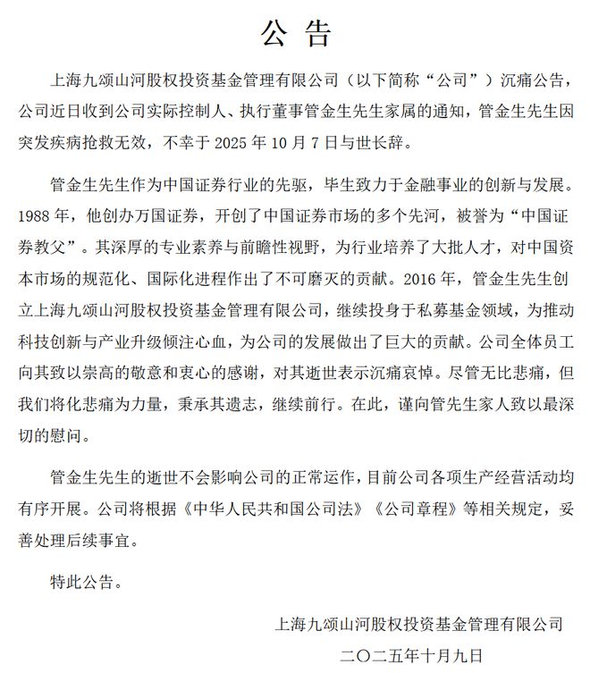 中经记者 罗辑 北京报道 10月9日深夜,上海九颂山河股权投资基金管理有限公司发布公告称,公司近日收到公司实际控制人、 执行董事管金生家属的通知,管金生因突发疾病抢救无效,不幸于2025年10月7日与世长辞。 管金生是中国证券发展史中无法绕开的名字。他是中国第一家证券公司万国证券的创办者,并从3500万 元资本金起步,在6年内将万国证券发展成资产规模达数十亿元的综合性证券公司,创造了中国证券业 的一大奇迹。上交所1990年成立时,其交易规则、设备、交易员的培训等都有万国证券参与。但此后, 万国证券因"327国债事件"一夜之间从巅峰跌落至破产边缘,最终与申银证券整合成申银万国。如今的 申万宏源证券名字中的"万",正是过去那段风云际会的"注脚"。 (编辑:夏欣 审核:何莎莎 校对:颜京宁) ...