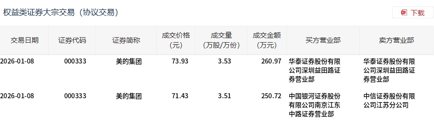1月8日,美的集团大宗交易成交7.04万股,成交额511.69万元,占当日总成交额的0.21%,成交均价72.68元,较市场收盘价 79.03元折价8.03%,其中最高成交价73.93元,最低成交价71.43元。 | 交易日期 | 证券代码 | 证券简称 | 成交价格 | 成交量 | 成交全额 | 买方营业部 | 卖方营业部 | | --- | --- | --- | --- | --- | --- | --- | --- | | | | | (元) | (万股/万份) | (万元) | | | | 2026-01-08 | 000333 | 美的集团 | 73.93 | 3.53 | 260.97 | 华泰证券股份有限 | 华泰证券股份有限 | | | | | | | | 公司深圳益田路证 | 公司深圳益田路证 | | | | | | | | 券营业部 | 券营业部 | | 2026-01-08 | 000333 | 美的集团 | 71.43 | 3.51 | | 250.72 中国银河证券股份 | 中信证券股份有限 | | | | | | | | 有限公司南京江东 | 公司江苏分公司 | | | | | ...