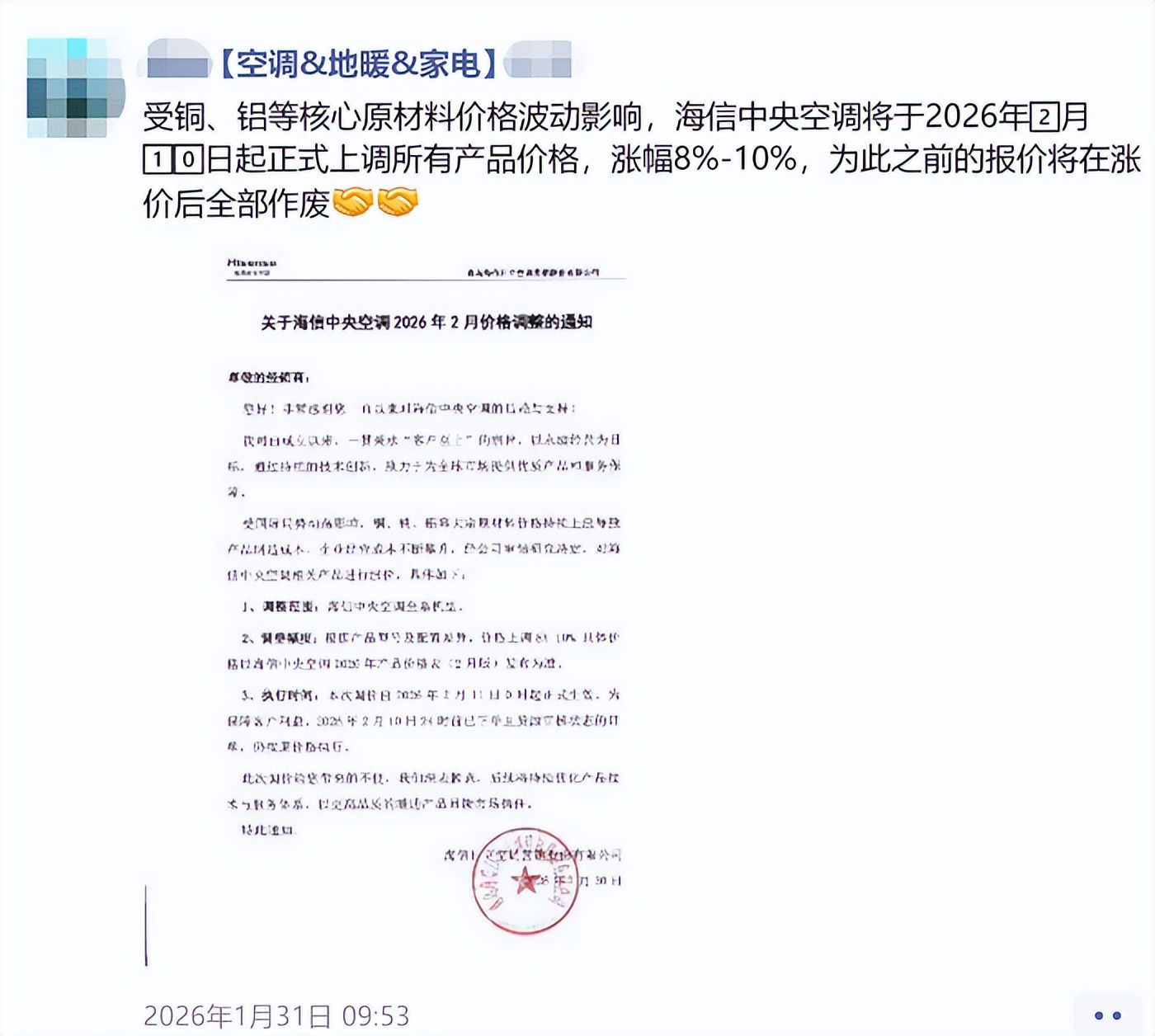 元旦刚过,中央空调市场便迎来一波密集的涨价通知。一位经销商在朋友圈转发海信中央空调的调价函时,或许并未意识到,这仅是冰山一角——一场始于 2025年底的行业性价格调整,正全面铺开。 早在2025年12月,镁刻阳光和iCongo丨志高智能环境已率先宣布,自2026年1月1日起上调产品提货价。2026年1月初,TCL、奥克斯等品牌迅速跟进。至1月 下旬,日立、海信、约克VRF、科龙等品牌纷纷加入,另有美的、格力等品牌施行了区域性的涨价通知,形成行业性的集体调价浪潮,涨幅普遍介于3%至 10%。 鑲刻 阳光 | MEKER 铝、冷媒等大宗原材料 因铜√ 价格上涨 2026年1月1日起 镁刻阳光空调全系列价格上调 5% 2026年1月1日起 因核心原材料价格上涨 iCongo全系列产品价 RISE IN PR 0 200 8169007 总部地址:广东省佛山 iCongo 志高智能环境 # 奥克斯空调温馨提示 # 1月10日起热销机型价格上调 5%-8% 感谢理解与支持 TQ 英全中国雷值本部空间产品经营中心 关于 TCL 空调产品1 各大区战区、各经销商: 近期空调相关大来原材料价格持 且上涨趋势仍在持续。此外,其 ...
