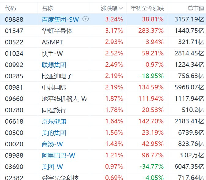 格隆汇11月20日|港股科技股普涨,恒生科技指数高开0.7%。个股中,百度、华虹半导体涨超3%, ASMPT、快手、联想集团、比亚迪电子、中芯国际涨超2%,阿里、美的集团涨超1%。 | 代码 | 名称 | 涨跌幅 √ | 年初至今涨跌 | 总市值 | | --- | --- | --- | --- | --- | | 09888 | 百度集团-SW ⊙ | 3.24% | 38.81% | 3157.19亿 | | 01347 | 华虹半导体 | 3.17% | 283.37% | 1440.75亿 | | 00522 | ASMPT | 2.93% | 3.94% | 321.71亿 | | 01024 | 快手-W | 2.52% | 59.21% | 2814.45亿 | | 00992 | 联想集团 | 2.49% | 0.97% | 1224.34亿 | | 00285 | 比亚迪电子 | 2.19% | -18.95% | 756.63亿 | | 00981 | 中心国际 | 2.19% | 134.59% | 5968.07亿 | | 09660 | 地平线机器人-W | 1.87% | 111 ...