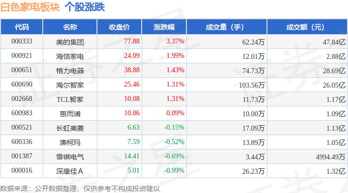 证券之星消息,1月29日白色家电板块较上一交易日上涨2.42%,美的集团领涨。当日上证指数报收于4157.98,上涨0.16%。深证成指报收于 14300.08,下跌0.3%。白色家电板块个股涨跌见下表: | 代码 | 名称 | 收盘价 | 涨跌幅 | 成交量(手) | 成交额(元) | | | --- | --- | --- | --- | --- | --- | --- | | 000333 | 美的集团 | 77.88 | 3.37% | 62.24万 | | 47.84亿 | | 000921 | 海信家电 | 24.09 | 1.99% | 12.01万 | | 2.88亿 | | 000651 | 格力电器 | 38.88 | 1.43% | - 74.73万 | | 28.69亿 | | 600690 | 海尔智家 | 25.46 | 1.31% | 103.56万 | | 26.05亿 | | 002668 | TCL智家 | 10.08 | 1.31% | 11.73万 | | 1.17亿 | | 600983 | 惠而浦 | 10.86 | 0.09% | 10.00万 | | 1.09亿 ...