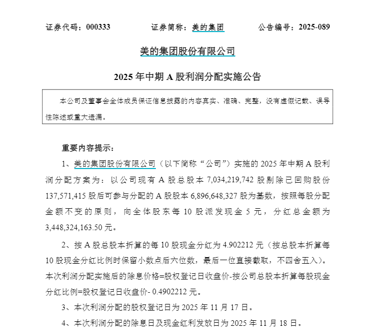#美的中期分红34.48亿元#【美的集团:2025年中期A股利润分配方案10派5元 分红总金额34.48亿元】# 美的分红每10股派发现金5元# 美的集团公告称,公司2025年中期A股利润分配方案为:向全体股东每10 股派发现金5元,分红总金额为34.48亿元。股权登记日为2025年11月17日,除息日及现金红利发放日为 2025年11月18日。(智通财经) ...