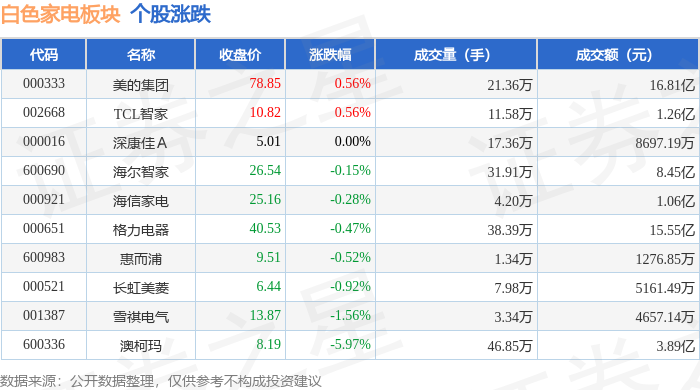 证券之星消息,12月30日白色家电板块较上一交易日上涨0.12%,美的集团领涨。当日上证指数报收于 3965.12,下跌0.0%。深证成指报收于13604.07,上涨0.49%。白色家电板块个股涨跌见下表: | 代码 | 名称 | 主力净流入(元) | 主力净占比 游资净流入 (元) | | 游资净占比 散户净流入 (元) | | 散户净占比 | | --- | --- | --- | --- | --- | --- | --- | --- | | 001387 | 雪祺电气 | -13.83万 | -0.30% | -156.71万 | -3.36% | 170.54万 | 3.66% | | 600983 | 惠而浦 | -53.67万 | -4.20% | 98.39万 | 7.71% | -44.73万 | -3.50% | | 002668 | TCL智家 | -88.87万 | -0.71% | 346.85万 | 2.76% | -257.98万 | -2.05% | | 000921 海信家电 | | -366.29万 | -3.47% | 673.84万 | 6.39% | -307.55万 ...