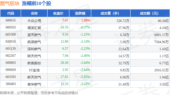 | 代码 | 名称 | 收盘价 | 涨跌幅 | 成交量(手) | 成交额(元) | | --- | --- | --- | --- | --- | --- | | 600635 | 大众公用 | 7.47 | 1.08% | 526.72万 | 40.34亿 | | 000593 | 德龙汇能 | 10.76 | -0.37% | 37.96万 | 4.10亿 | | 605368 | 蓝天燃气 | 9.50 | -1.25% | 6.38万 | 6081.17万 | | 920010 | 凯添燃气 | 12.80 | -2.14% | 5.90万 | 7584.90万 | | 601139 | 深圳燃气 | 6.57 | -2.23% | 21.64万 | 1.43亿 | | 002267 | 陕天然气 | 7.94 | -2.46% | 14.57万 | 1.17亿 | | 600803 | 新奧股份 | 20.30 | -2.64% | 32.79万 | 6.77亿 | | 000669 | ST金湾 | 2.95 | -2.64% | 9.85万 | 2916.55万 | | 603393 | 新天然 ...