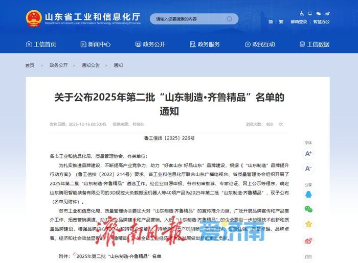 -1- 通知要求,各市工业和信息化局、质量管理协会要加大对"山东制造.齐鲁精品"的宣传推介力度,广泛 开展品牌宣传和产品推介工作,拓宽营销渠道,助力企业品牌建设和产品营销。入选"山东制造.齐鲁精 品"的企业要进一步加强技术创新和质量品牌建设,增强品牌核心竞争力和持续发展能力,持续研发出 产权明晰、节能环保、创新性强、质量卓越、品牌卓著、经济和社会效益显著的"齐鲁精品",为全省工 业经济高质量发展作出新的更大贡献。 2025 年第二批"山东制造·齐鲁精品"名单 | | 企业名称 | 品名称 | | --- | --- | --- | | | 、高端装备类 | | | 1 | 山东腾阳智能装备有限公司 | 3D 视控大负载搬运机器人 | | 2 | 青岛思普润水处理股份有限公司 | 生物膜流化床(MBBR)集成装备 | | 3 | 山东国兴智能科技股份有限公司 | 消防灭火机器人 | | 4 | 威飞海洋装备制造有限公司 | 近海区域海洋水下油气生产系统装备 | | 5 | 山东创宇能源科技股份有限公司 | SCR 脱硝分级精准喷氨智能控制装置 | | 6 | 烟台台海玛努尔核电设备有限公司 | 第四代核电高温气 ...