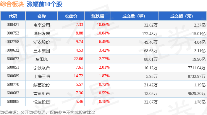 Market Overview - On October 28, the comprehensive sector rose by 2.26% compared to the previous trading day, with Nanjing Public Utilities leading the gains [1] - The Shanghai Composite Index closed at 3988.22, down 0.22%, while the Shenzhen Component Index closed at 13430.1, down 0.44% [1] Top Gainers - Nanjing Public Utilities (Code: 000421) closed at 7.33, up 10.06% with a trading volume of 326,200 shares and a turnover of 237 million yuan [1] - Zhangzhou Development (Code: 000753) closed at 8.88, up 10.04% with a trading volume of 1,724,800 shares and a turnover of 1.501 billion yuan [1] - Zhejiang Agricultural Shares (Code: 002758) closed at 9.74, up 6.45% with a trading volume of 494,600 shares and a turnover of 484 million yuan [1] Market Capital Flow - The comprehensive sector experienced a net outflow of 11.4682 million yuan from main funds, while retail funds saw a net inflow of 70.4766 million yuan [2] - The net outflow from speculative funds was 59.0084 million yuan [2] Individual Stock Fund Flow - Dongyangguang (Code: 600673) had a net inflow of 273 million yuan from main funds, while speculative funds saw a net outflow of 64.8175 million yuan [3] - Nanjing Public Utilities (Code: 000421) experienced a net inflow of 63.2905 million yuan from main funds, with a net outflow of 37.4135 million yuan from speculative funds [3] - Shanghai Sanmao (Code: 600689) had a net inflow of 5.8931 million yuan from main funds, while speculative funds saw a net outflow of 6.3665 million yuan [3]