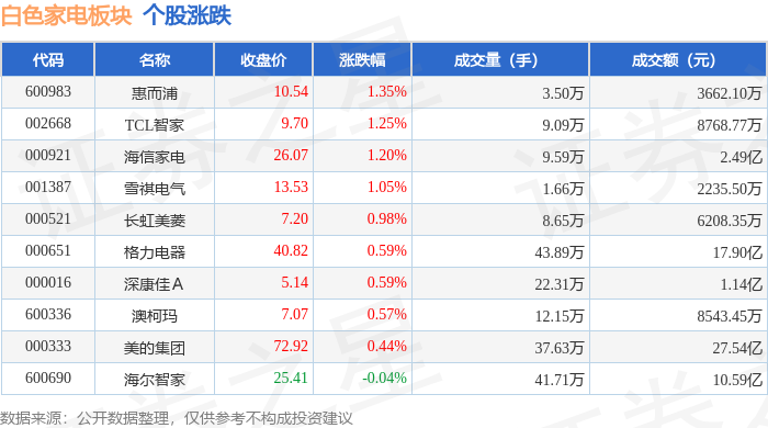 证券之星消息,10月10日白色家电板块较上一交易日上涨0.35%,惠而浦领涨。当日上证指数报收于 3897.03,下跌0.94%。深证成指报收于13355.42,下跌2.7%。白色家电板块个股涨跌见下表: | 代码 | 名称 | 收盘价 | 涨跌幅 | 成交量(手) | 成交额(元) | | | --- | --- | --- | --- | --- | --- | --- | | 600983 | 惠而浦 | 10.45 | 2.25% | 3.68万 | | 3818.60万 | | 002668 | TCL智家 | 9.81 | 1.34% | 16.07万 | | 1.57亿 | | 600690 | 海尔智家 | 25.66 | 0.86% | 57.01万 | | 14.67 乙 | | 000921 | 海信家电 | 25.92 | 0.74% | 15.03万 | | 3.91亿 | | 600336 | 澳柯玛 | 7.01 | 0.72% | 18.83万 | | 1.32亿 | | 000521 | 长虹美菱 | 7.21 | 0.70% | 15.90万 | | 1.15亿 | | 0 ...