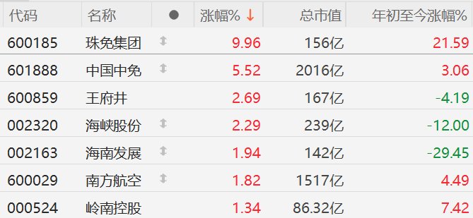 | 代码 | 名称 | 9 | 涨幅% ↓ | 总市值 | 年初至今涨幅% | | --- | --- | --- | --- | --- | --- | | 600185 | 珠免集团 | + | 9.96 | 156亿 | 21.59 | | 601888 | 中国中免 | + | 5.52 | 2016亿 | 3.06 | | 600859 | 王府井 | | 2.69 | 167亿 | -4.19 | | 002320 | 海峡股份 | 1 | 2.29 | 239亿 | -12.00 | | 002163 | 海南发展 | 1 | 1.94 | 142亿 | -29.45 | | 600029 | 南方航空 | + | 1.82 | 1517亿 | 4.49 | | 000524 | 岭南控股 | | 1.34 | 86.32亿 | 7.42 | 格隆汇2月9日|A股市场免税股走强,其中,珠免集团(维权)涨停,中国中免涨超5%,王府井、海 峡股份涨超2%。 ...