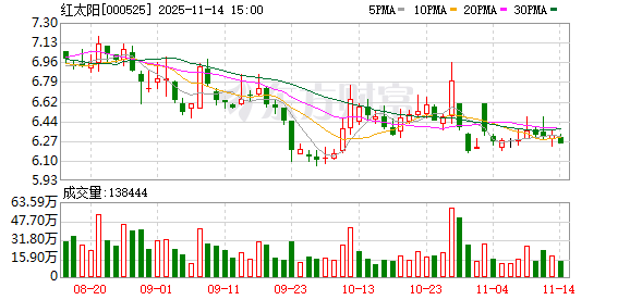 11月19日,红太阳盘中下跌2.08%,截至09:54,报6.11元/股,成交3302.25万元,换手率0.54%,总市值 79.31亿元。 资金流向方面,主力资金净流出591.82万元,特大单买入0.00元,占比0.00%,卖出499.94万元,占比 15.14%;大单买入480.41万元,占比14.55%,卖出572.29万元,占比17.33%。 红太阳所属申万行业为:基础化工-农化制品-农药。所属概念板块包括:摘帽概念、草甘膦、NMN概 念、低价、生物农药等。 截至10月20日,红太阳股东户数4.33万,较上期减少2.91%;人均流通股22852股,较上期增加2.99%。 2025年1月-9月,红太阳实现营业收入23.28亿元,同比减少13.87%;归母净利润-2.72亿元,同比减少 1115.05%。 分红方面,红太阳A股上市后累计派现11.46亿元。近三年,累计派现0.00元。 责任编辑:小浪快报 红太阳今年以来股价涨2.35%,近5个交易日跌3.17%,近20日跌6.43%,近60日跌11.83%。 今年以来红太阳已经3次登上龙虎榜,最近一次登上龙虎榜为6月18日,当日龙虎榜净买入-4983.72 ...