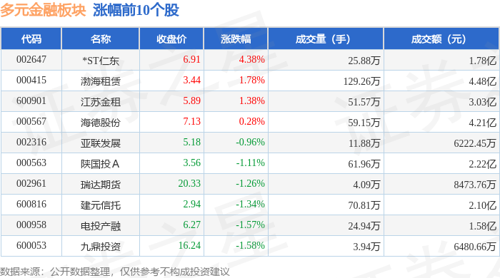 | 代码 | 名称 | 收盘价 | 涨跌幅 | 成交量(手) | 成交额(元) | | --- | --- | --- | --- | --- | --- | | 603300 | 海南华铁 | 7.09 | -6.96% | 357.44万 | 25.02亿 | | 000935 | 四川双马 | 68.81 | -5.82% | 10.65万 | 2.17亿 | | 600517 | 国网英大 | 5.59 | -4.77% | 41.02万 | 2.34亿 | | 000617 | 中油资本 | 10.50 | -4.72% | 202.72万 | 22.07亿 | | 000532 | 华金资本 | 13.57 | -3.90% | 7.70万 | 1.06亿 | | 002423 | 中粮资本 | 12.78 | -3.84% | 42.27万 | 5.52亿 | | 300773 | 拉卡拉 | 23.08 | -2.78% | 20.29万 | 4.78亿 | | 600927 | 永安期货 | 14.38 | -2.38% | 5.09万 | 7411.54万 | | 600318 | 新力金 ...