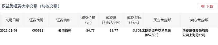 | 交易日期 | 证券代码 | 证券简称 | 成交价格 | 成交量 | 成交金额 (万元) | 买方营业部 | 卖方营业部 | | --- | --- | --- | --- | --- | --- | --- | --- | | | | | (元) | (万股/万份) | | | | | 2026-01-26 | 000538 | 云南白药 | 54.77 | 65.77 | | 3,602.2 招商证券交易单元 | 华泰证券股份有限 | | | | | | | (052300) | | 公司上海分公司 | 1月26日,云南白药大宗交易成交65.77万股,成交额3602.22万元,占当日总成交额的5.54%,成交价 54.77元,较市场收盘价56.17元折价2.49%。 ...