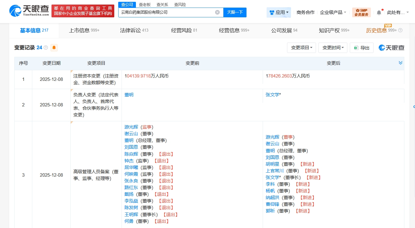 更公司 查老板 童关系 查风险 都 在 用 的 商 业 查 词 工 具 (× 云南白药集团股份有限公司 天眼一下 国家中小企业发展子基金旗下机构 基本信息 217 上市信息 999+ 法律诉讼 413 经营风险 81 经营信息 999+ 主要股东 2 ● 品股权结构 股权变更历程140 ? 最新公示3 工商登记5 历史主要股东2 序号 股份类型 股东名称 云南省国有股权运营管理有限公司 器 1 流通A股 大股东 | 圆 省管国企 新华都实业集团股份有限公司 品 2 流通A股 大股东 云南合和(集团)股份有限公司 器 3 流通A股 大股东 | 国有独资 每经AI快讯,天眼查工商信息显示,近日,云南白药(000538)发生工商变更,董明卸任法定代表人,王明辉卸任董事长,由张文学接任,注册资本由约 10.4亿元人民币增至约17.8亿元人民币,同时,多位高管发生变更。云南白药集团股份有限公司成立于1993年11月,经营范围含化学原料药、化学药制剂、 中成药、中药材、生物制品、医疗器械等的销售,信息技术、科技及经济技术咨询服务,货物进出口等。股东信息显示,该公司由云南省国有股权运营管理 有限公司、新华都(002264) ...