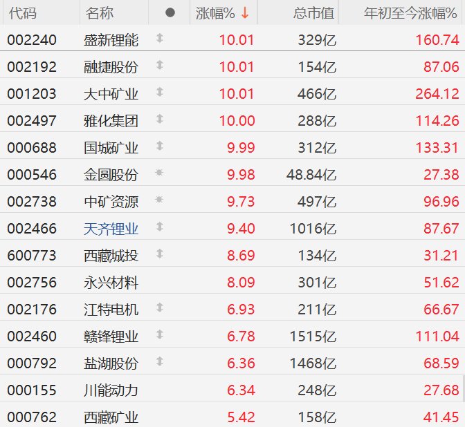| 代码 | 名称 | | 涨幅% ↓ | 总市值 | 年初至今涨幅%。 | | --- | --- | --- | --- | --- | --- | | 002240 | 盛新锂能 | 1 | 10.01 | 329亿 | 160.74 | | 002192 | 融围股份 | 1 | 10.01 | 154亿 | 87.06 | | 001203 | 大中矿业 | 1 | 10.01 | 466亿 | 264.12 | | 002497 | 雅化集团 | 1 | 10.00 | 288亿 | 114.26 | | 000688 | 国城矿业 | 1 | 9.99 | 312亿 | 133.31 | | 000546 | 金圆股份 | 海 | 9.98 | 48.84 乙 | 27.38 | | 002738 | 中矿资源 | 来 | 9.73 | 497亿 | 96.96 | | 002466 | 天齐锂业 | 1 | 9.40 | 1016亿 | 87.67 | | 600773 | 西藏城投 | 1 | 8.69 | 134亿 | 31.21 | | 002756 | 永兴材料 | | 8.09 | ...